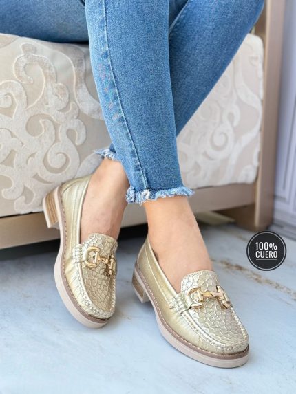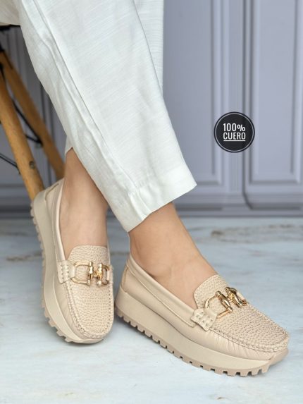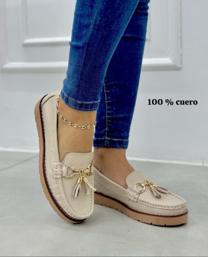 Cuero confort suela baja hebilla y borlas frente beige