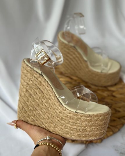 Sandalia plataforma con fajas cruzadas delanteras transparentes y con faja trasera transparente