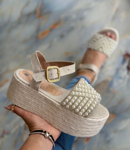 Sandalia plataforma con tacón plano y con pelotitas delanteras con faja trasera y hebilla