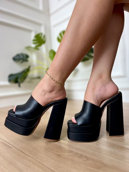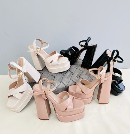Sandalia de tacón alto y grueso con una faja delantera y otra posterior con hebilla