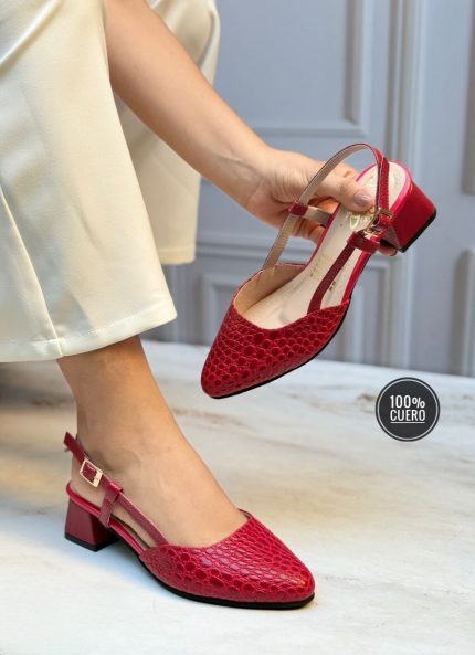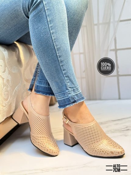 Tacones cerrados puntiagudos con detalles como manchas y agujeros enfrente con una faja y hebilla posterior