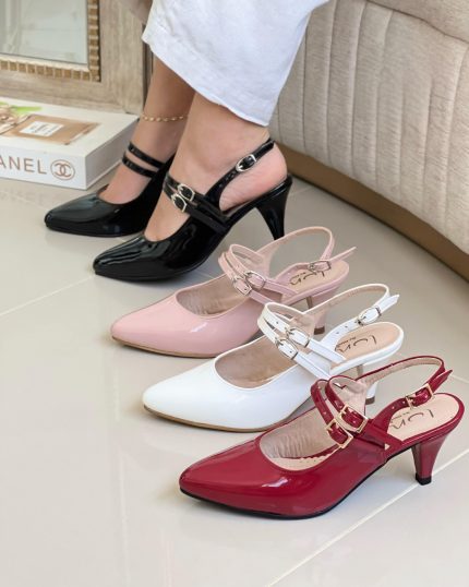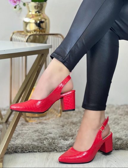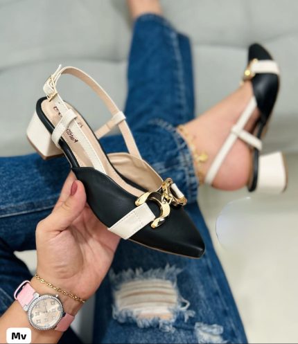 Sandalia tacón puntiagudo con tacón cuadrado y pequeño con faja posterior y hebilla