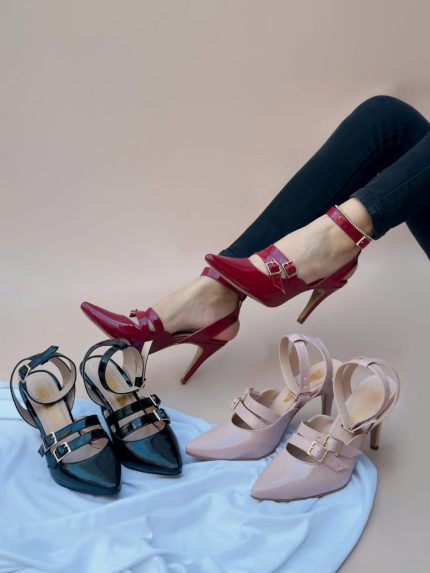 Sandalia tacón puntiagudo con dos fajas delanteras y sus hebillas con tacón pequeño y faja posterior