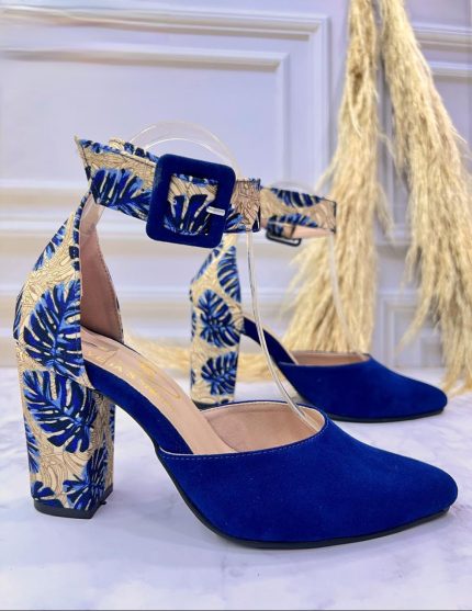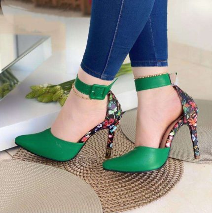 Sandalia tacón puntiagudo con detalles floreados con tacón fino y faja posterior con hebilla