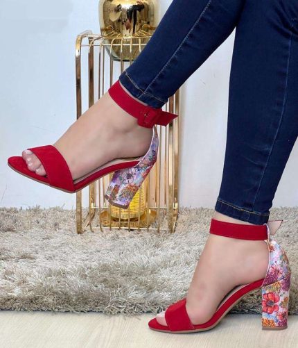 Sandalia tacón puntiagudo con detalles florales en el tacón y en la faja posterior