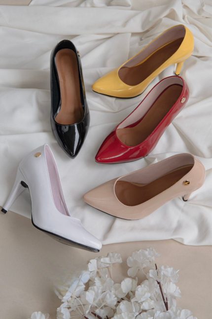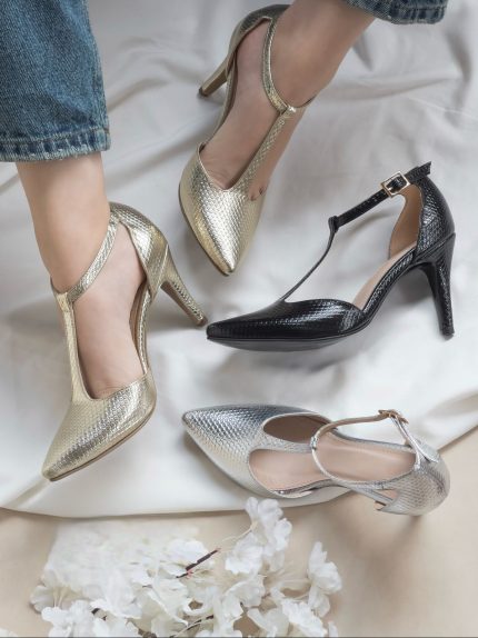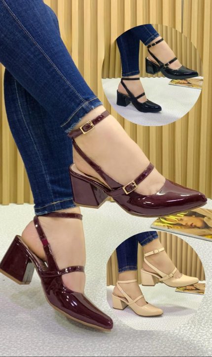 Tacones puntiagudos abiertos de enfrente y de los lados con una faja y hebilla
