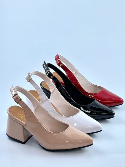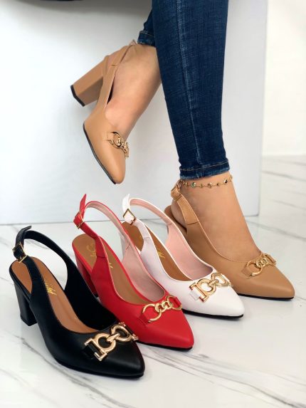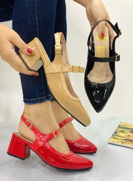 Tacones puntiagudos con tacón grueso y con una faja posterior con hebilla