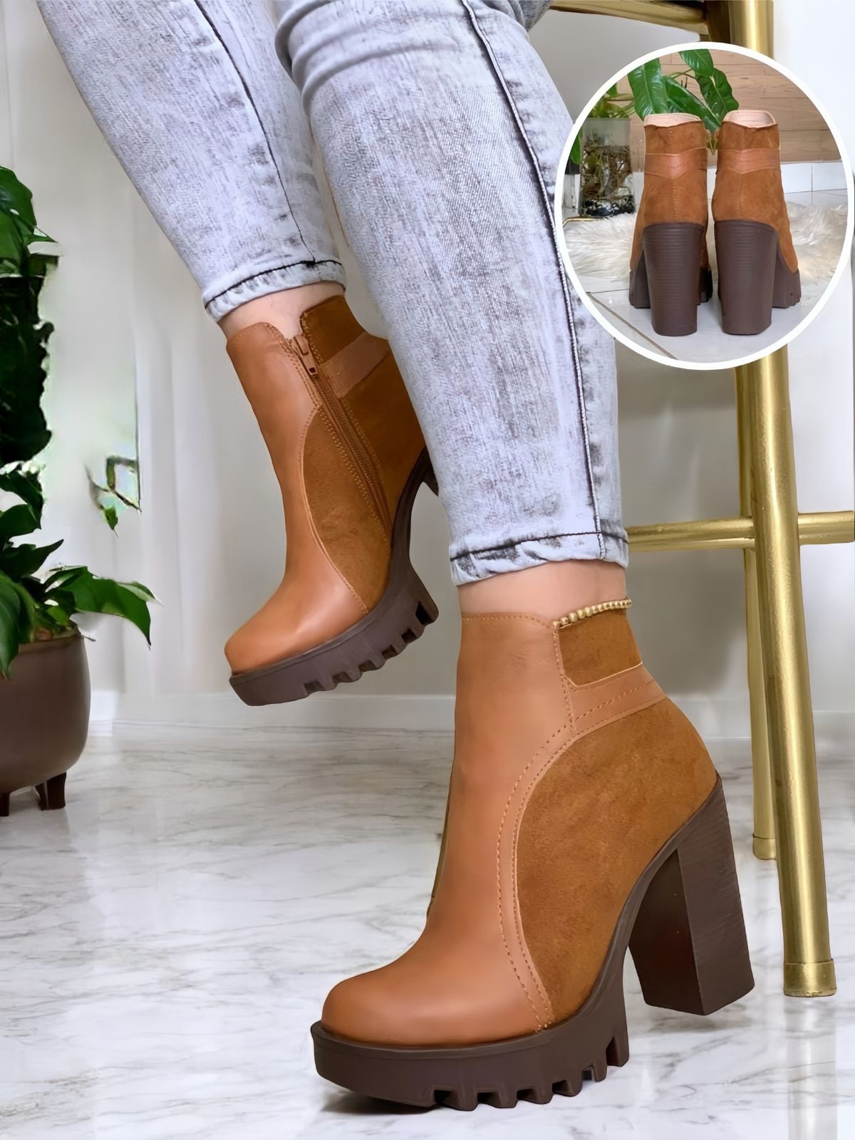Botas altas gama importada gamuza perlitas doradas lateral superior cafe