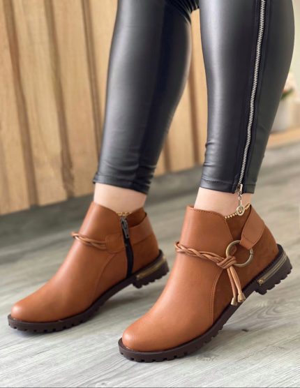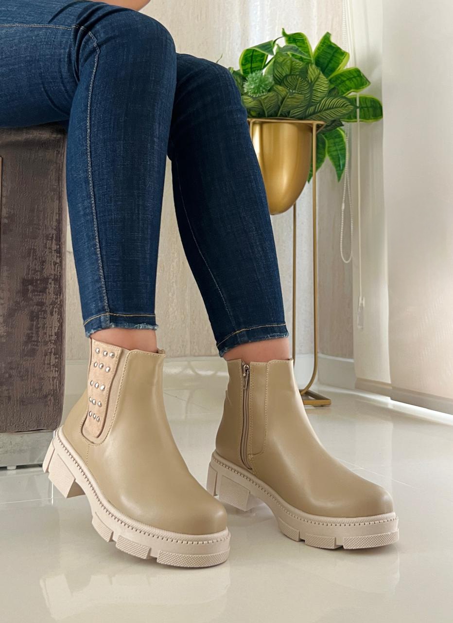 Botas piel boston gamuza suela dentada con franja de perlas lateral beige