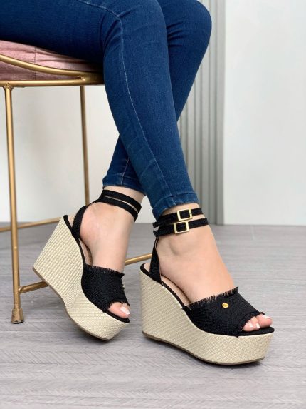 Sandalia plataforma de tacón pequeño con abertura enfrente y en los lados con una fajita posterior