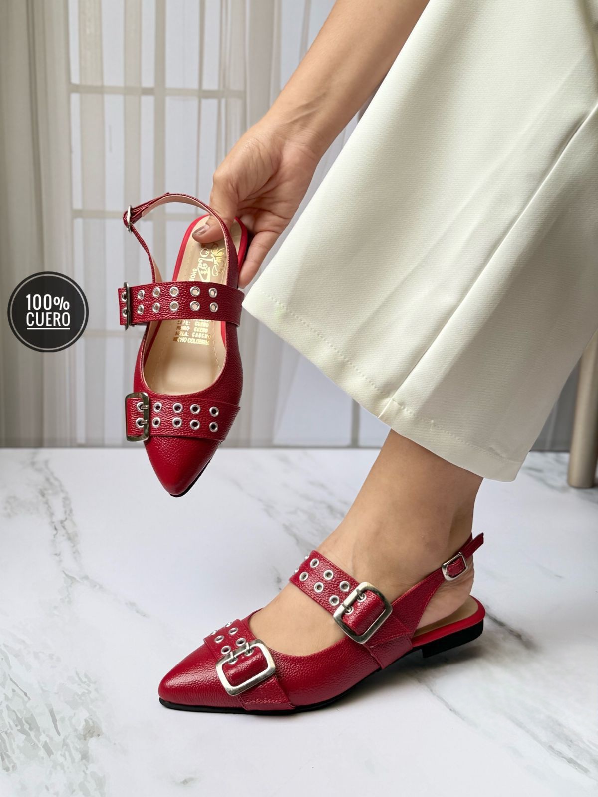 Tacones puntiagudos con dos fajas delanteras y agujeros metálicos con faja posterior y hebillas