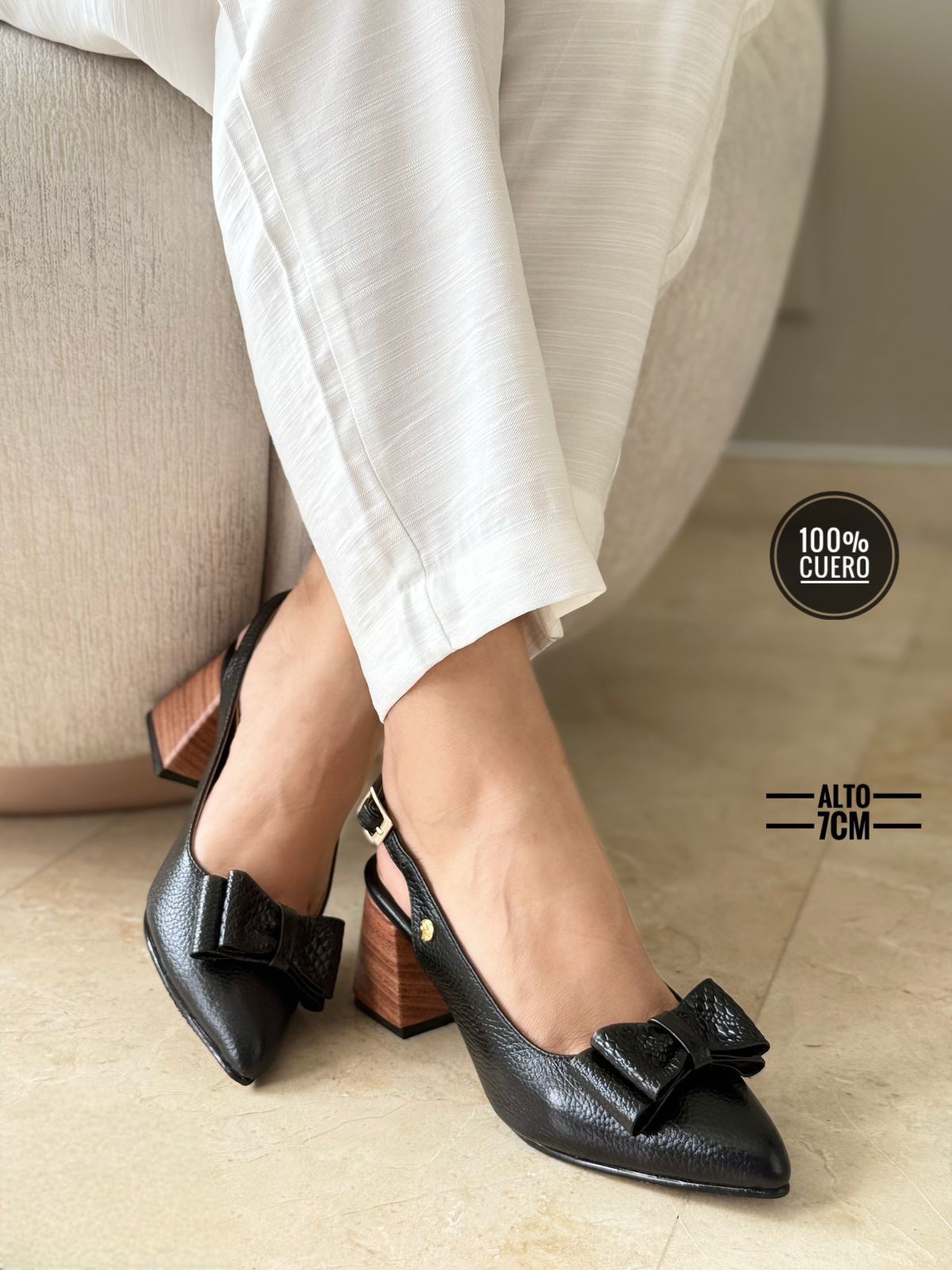 Tacones puntiagudos con una corbata enfrente y una faja posterior con hebilla