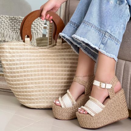 Sandalia plataforma de yute artesanal con una faja de nudo y con una agujeta trasera hasta el tobillo